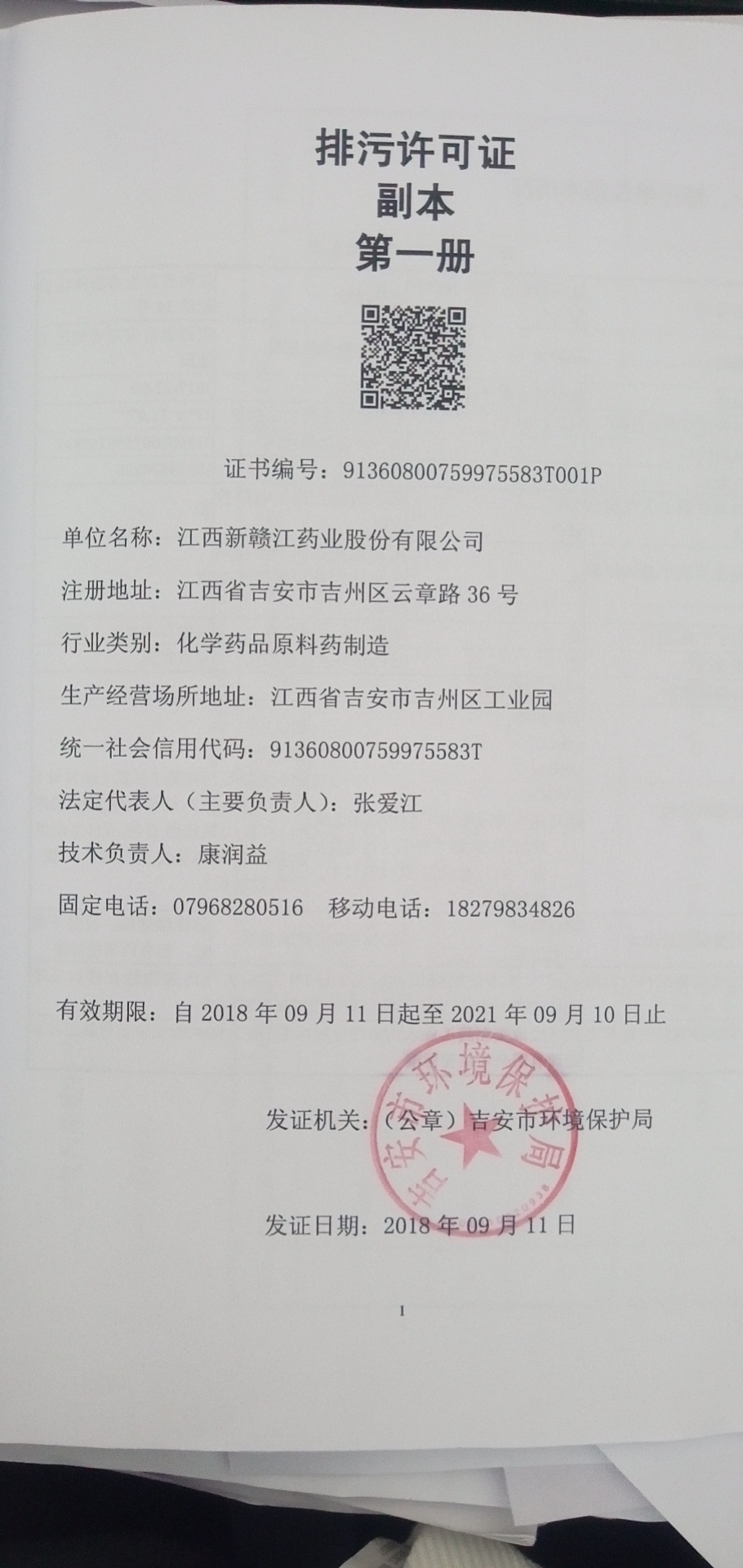 江西新贛江藥業(yè)股份有限公司排污許可證
